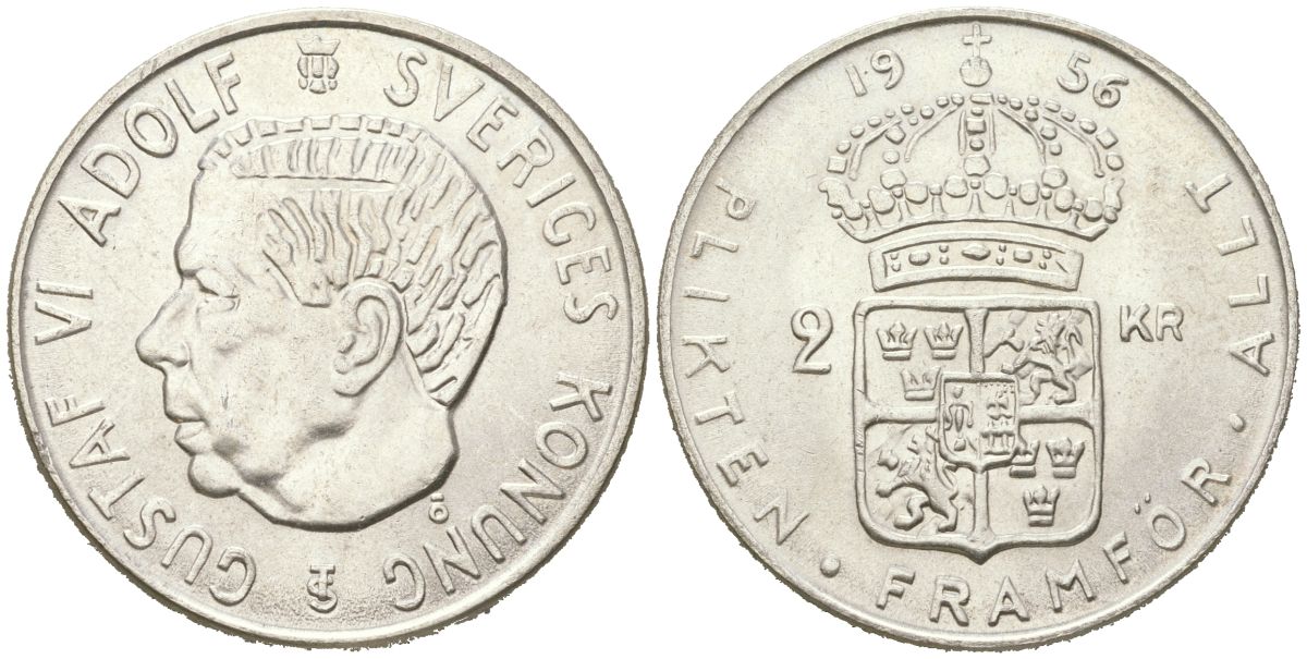 Швеция 2 кроны 1956 TS, Густав VI Адольф (1950-1973) KM 827 серебро UNC 81-1123