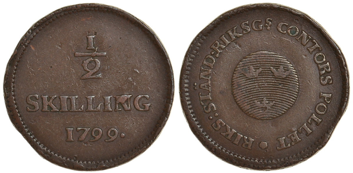 Швеция 1/2 скиллинга 1799 Густав IV Адольф (1792-1809) KM 549 медь 60-325
