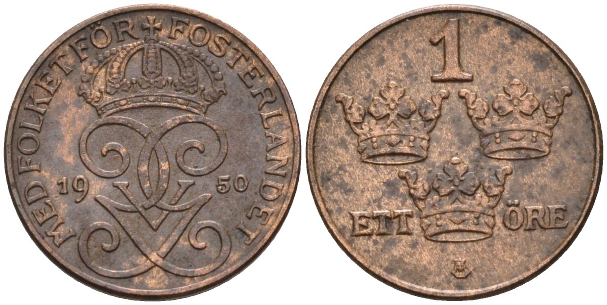 Швеция 1 эре 1950 Густав V (1907-1950) KM 777.2 бронза 4588-1068