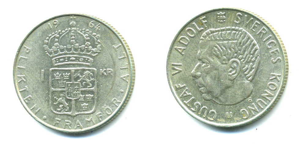 Швеция 1 крона 1964 U, Густав VI Адольф (1950-1973) KM 826 серебро 4381-445