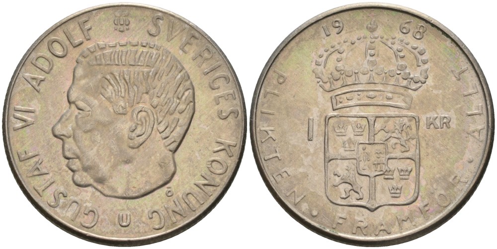 Швеция 1 крона 1968 U, Густав VI Адольф (1950-1973) KM 826а медь плакированная медно-никелем 4557-145
