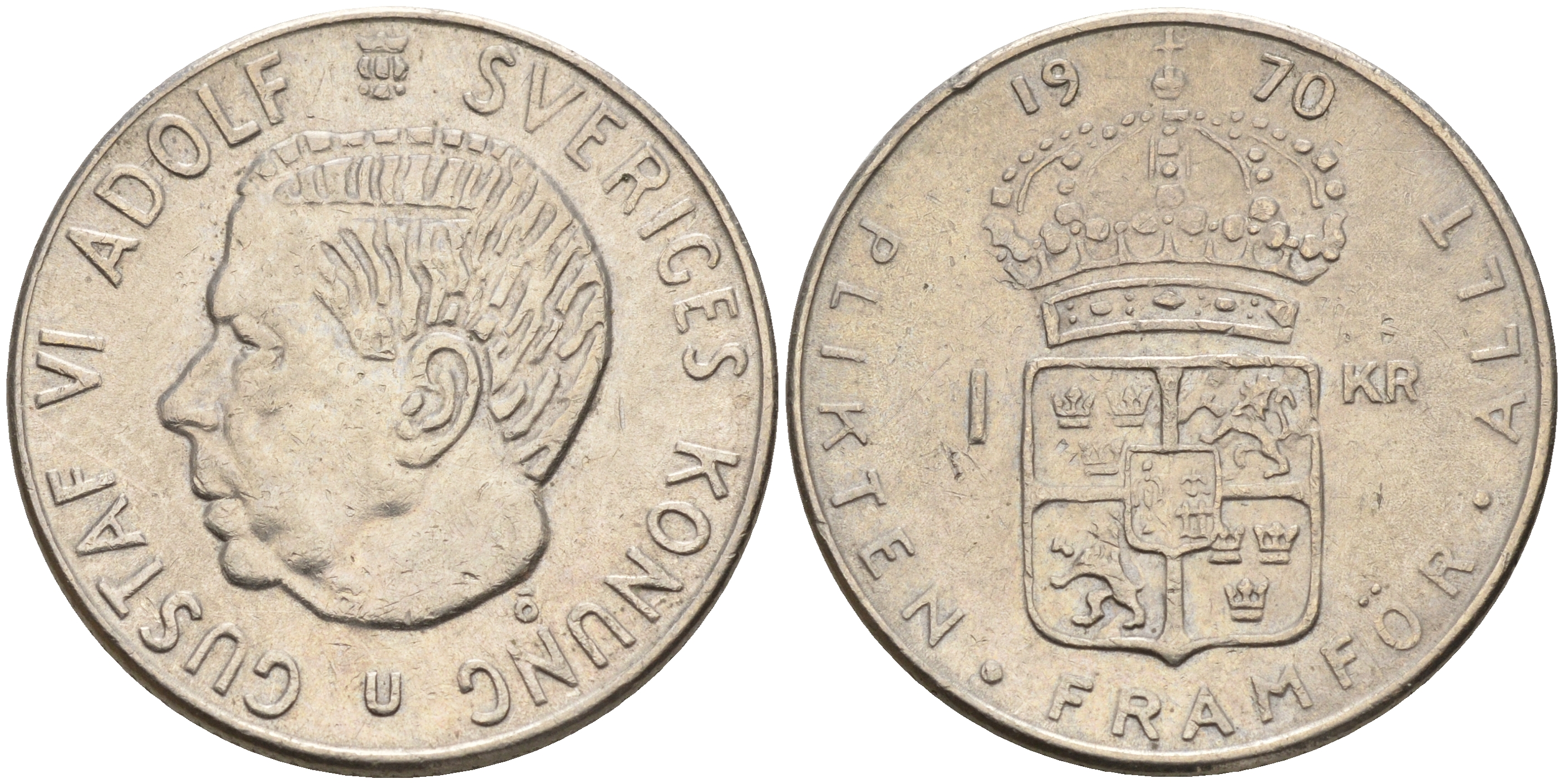 Швеция 1 крона 1970 U, Густав VI Адольф (1950-1973) KM 826а медь плакированная медно-никелем 4161-636