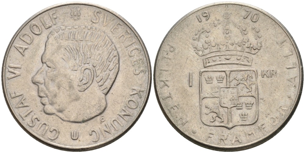 Швеция 1 крона 1970 U, Густав VI Адольф (1950-1973) KM 826а медь плакированная медно-никелем 4557-236