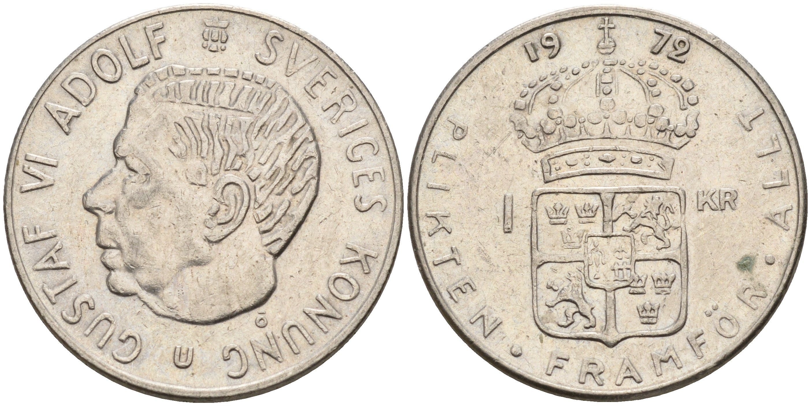 Швеция 1 крона 1972 U, Густав VI Адольф (1950-1973) KM 826а медь плакированная медно-никелем 4161-641