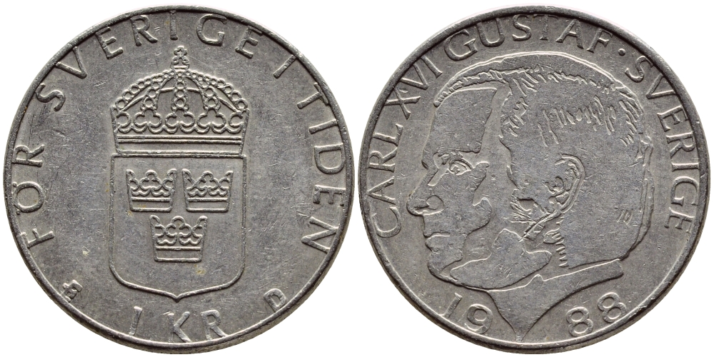 Швеция 1 крона 1988 Карл XVI Густав (1973- ) KM 852a медно-никель 4397-1221