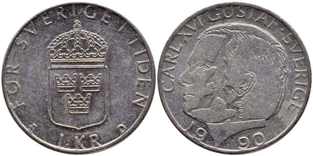 Швеция 1 крона 1990 Карл XVI Густав (1973- ) KM 852a медно-никель 4398-1241