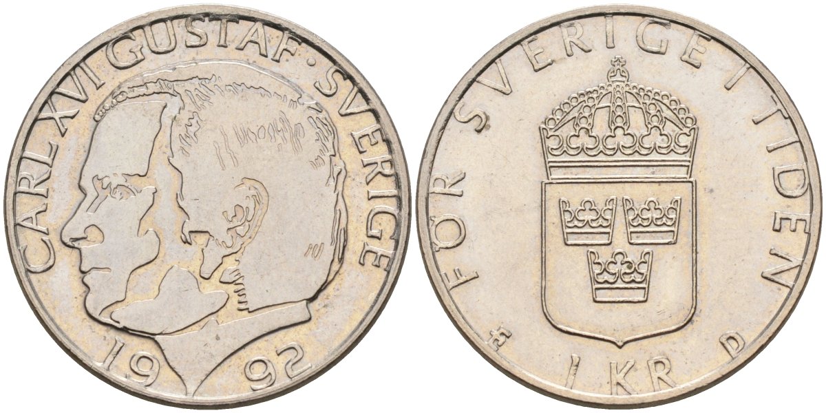 Швеция 1 крона 1992 Карл XVI Густав (1973- ) KM 852а медно-никель UNC 4582-516