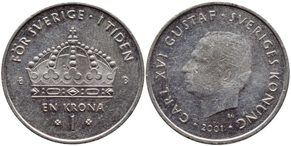 Швеция 1 крона 2001 Карл XVI Густав (1973- ) KM 894 медно-никель 4364-2635