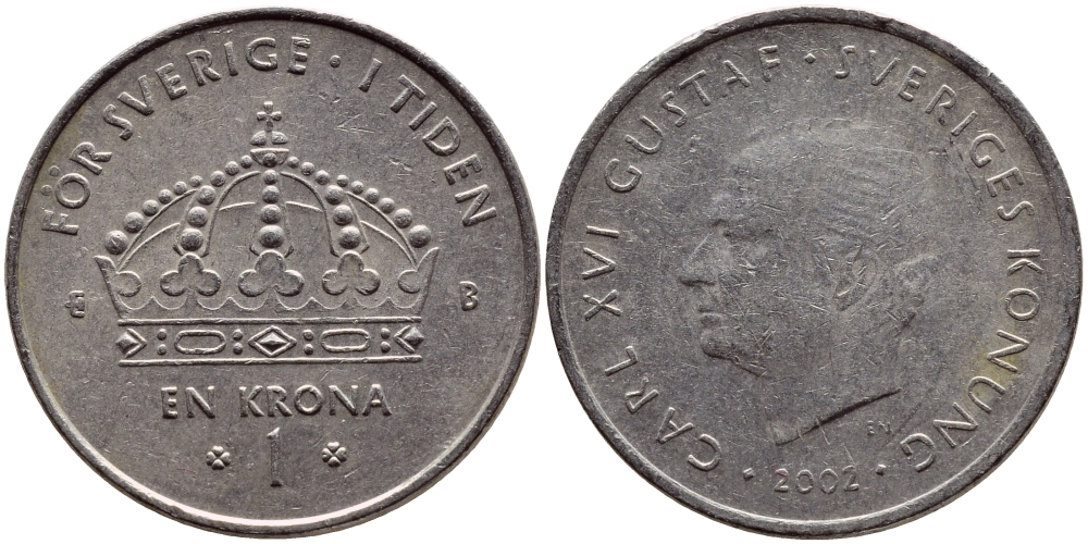 Швеция 1 крона 2002 Карл XVI Густав (1973- ) KM 894 медно-никель 4364-1443