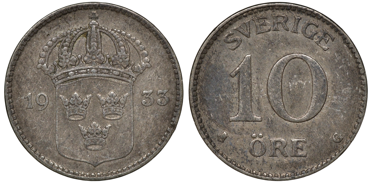 Швеция 10 эре 1933 G, Густав V (1907-1950) KM 780 серебро 4179-617