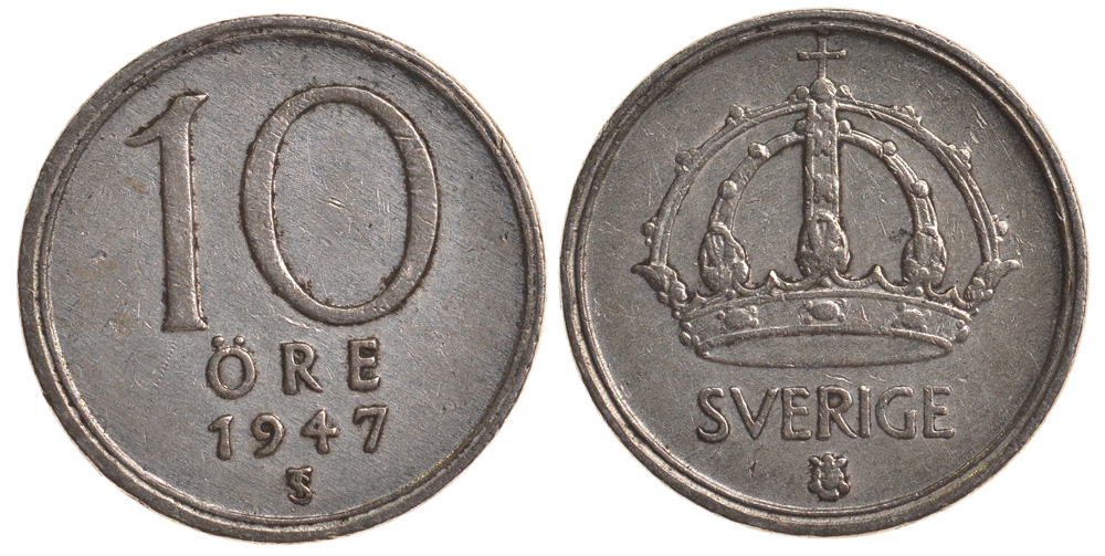 Швеция 10 эре 1947 TS, Густав V (1907-1950) KM 813 серебро 4179-544