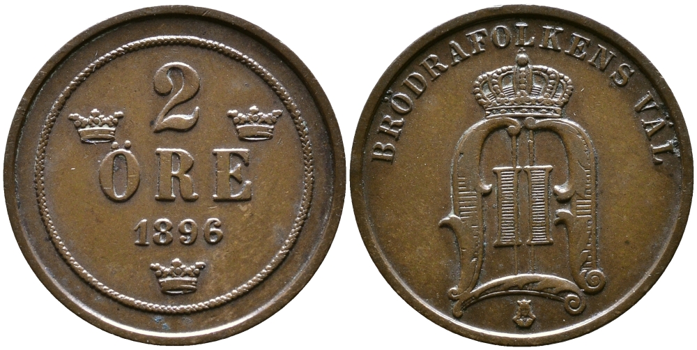 Швеция 2 эре 1896 Оскар II (1872-1907) король Швеции и Норвегии KM 746 бронза 56-456