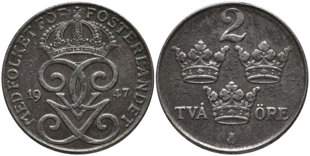 Швеция 2 эре 1947 Густав V (1907-1950) KM 811 железо 63-952