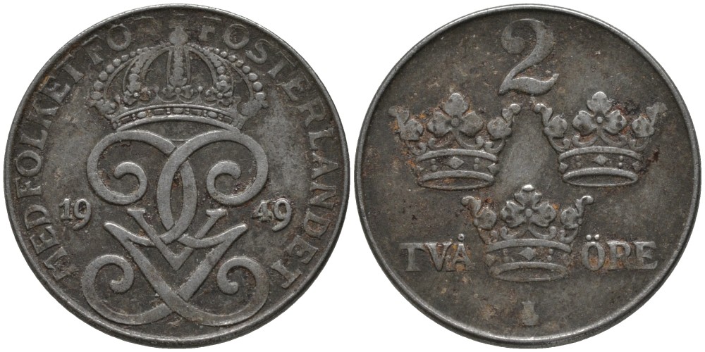 Швеция 2 эре 1949 Густав V (1907-1950), LONG 9 KM 811 железо 63-1034