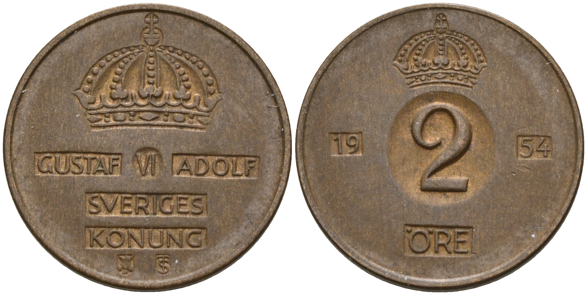 Швеция 2 эре 1954 TS, Густав VI Адольф (1950-1973) КМ 821 бронза 4602-654