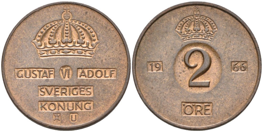 Швеция 2 эре 1966 U, Густав VI Адольф (1950-1973) KM 821 бронза 4364-831