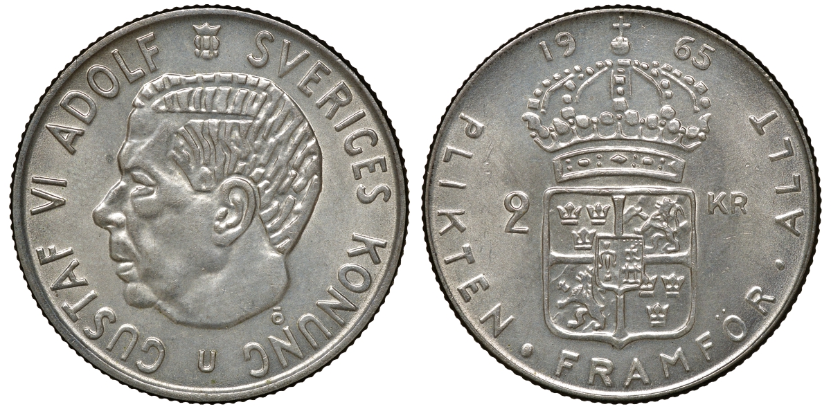 Швеция 2 кроны 1965 U, Густав VI Адольф (1950-1973) KM 827 серебро 4179-1342