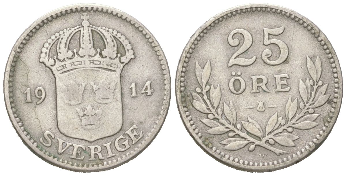 Швеция 25 эре 1914 W, Густав V (1907-1950) KM 785 серебро 44-751