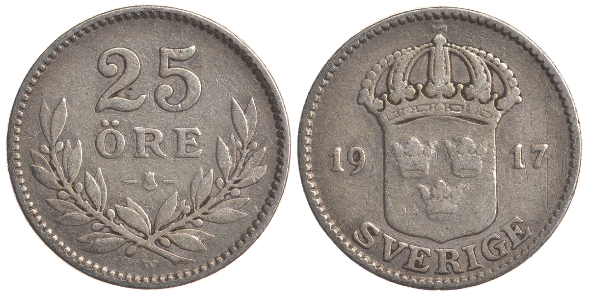 Швеция 25 эре 1917 W, Густав V (1907-1950) KM 785 серебро 4179-836