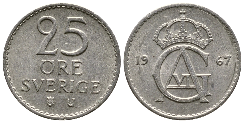 Швеция 25 эре 1967 U Густав VI Адольф (1950-1973) KM 836 медно-никель 3458-152
