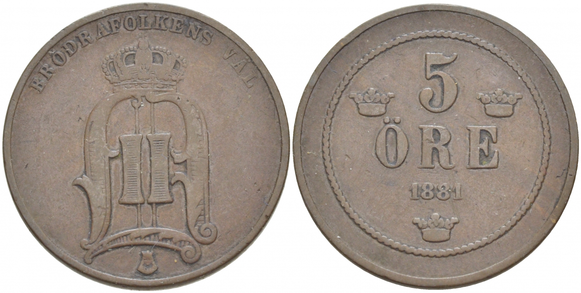 Швеция 5 эре 1881 Оскар II (1872-1907) король Швеции и Норвегии KM 736 (516) бронза 4548-1013