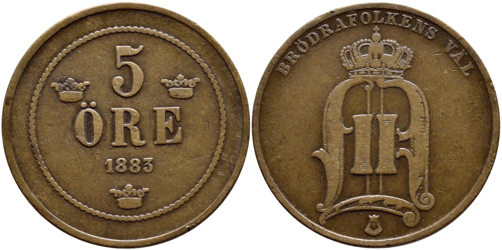 Швеция 5 эре 1883 Оскар II (1872-1907) король Швеции и Норвегии KM 736 бронза 1530-845