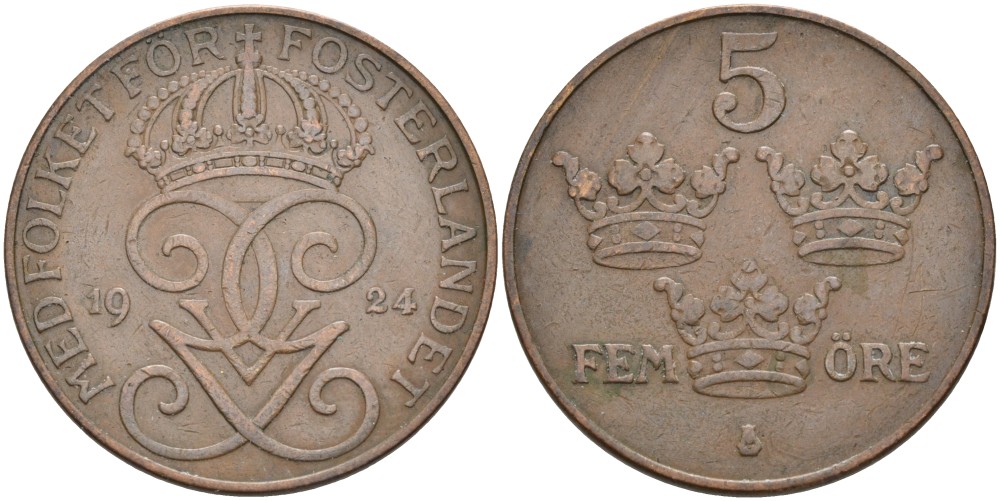 Швеция 5 эре 1924 Густав V (1907-1950) KM 779.2 бронза 4557-612