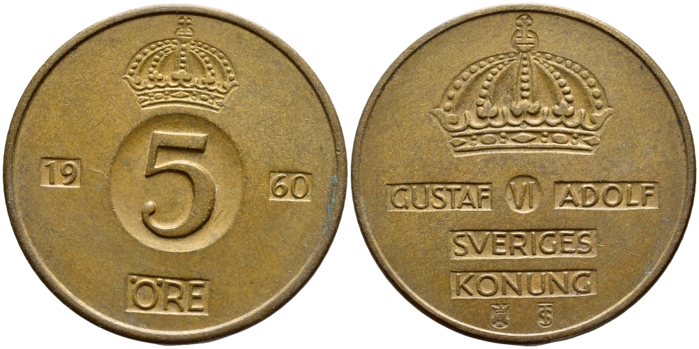 Швеция 5 эре 1960 TS Густав VI Адольф (1950-1973) KM 822 бронза 4397-153