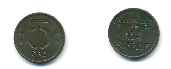 Швеция 5 эре 1973 U, Густав VI Адольф (1950-1973) KM 845 бронза 80-764