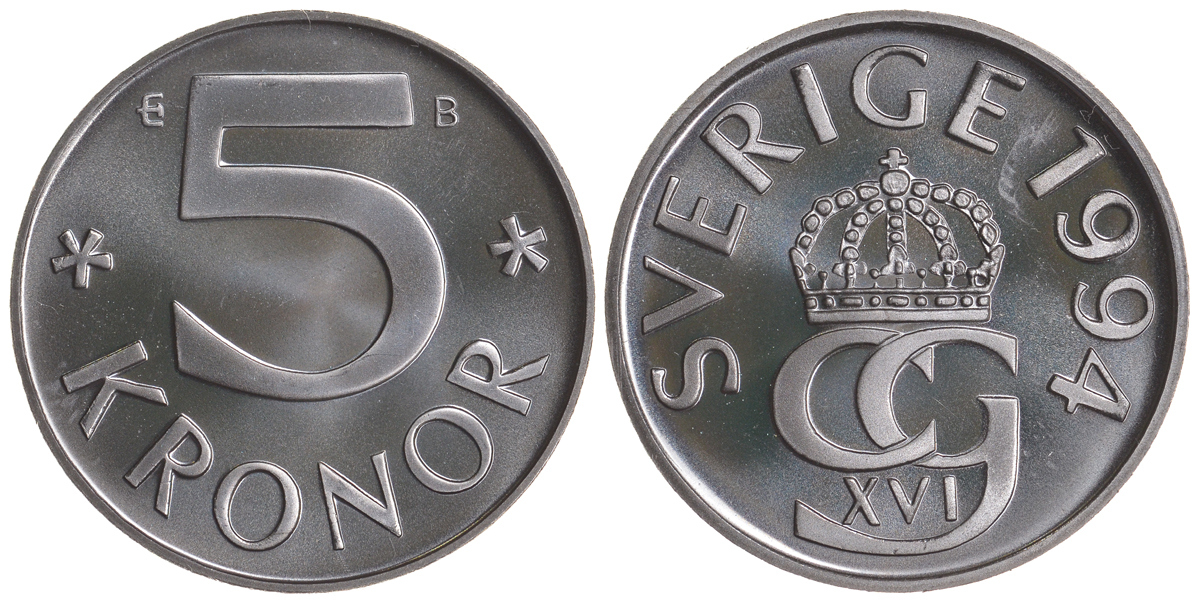 Швеция 5 крон 1994 B, Карл XVI Густав (1973- ) KM 853a медно-никель PROOFLIKE 4683-1016