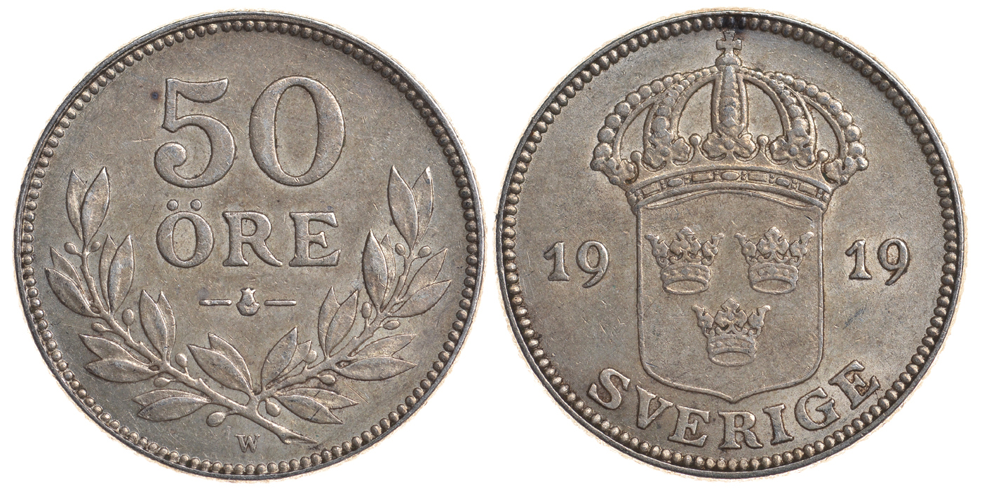 Швеция 50 эре 1919 W, Густав V (1907-1950) KM 788 серебро 4179-933