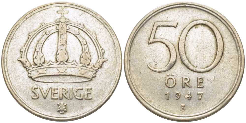 Швеция 50 эре 1947 TS, Густав V (1907-1950) KM 817 серебро 119-1045