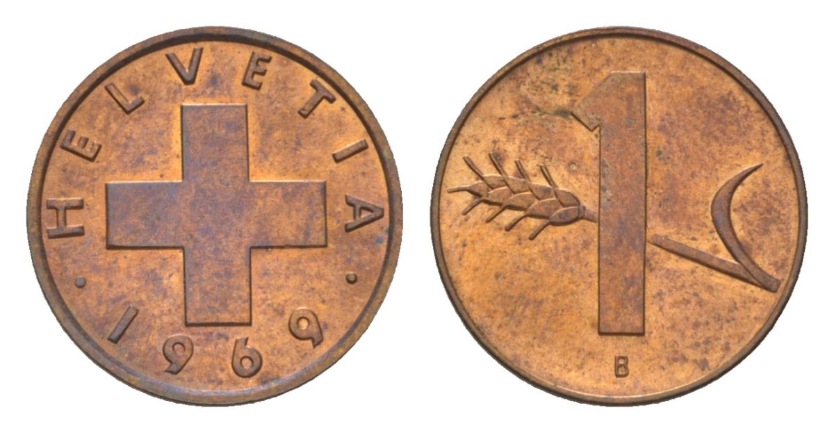 Швейцария 1 раппен 1969 B KM 46 бронза aUNC 4628-932