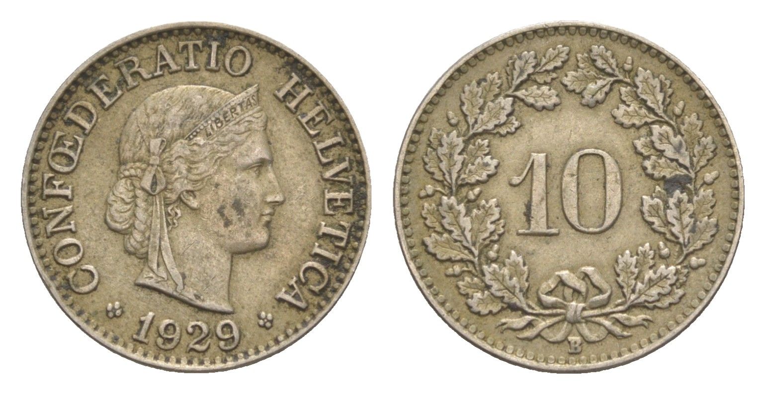 Швейцария 10 раппенов 1929 B KM 27 медно-никель 4627-1055