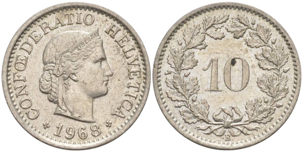 ШВЕЙЦАРИЯ 10 РАППЕНОВ 1968 В KM 27 медно-никель 55-412