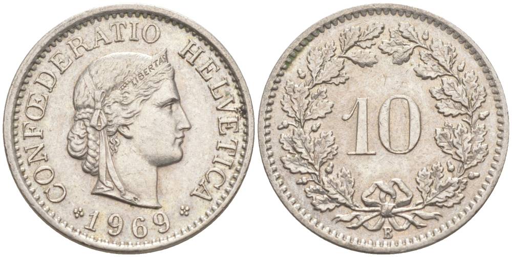 ШВЕЙЦАРИЯ 10 РАППЕНОВ 1969 В KM 27 медно-никель 55-415