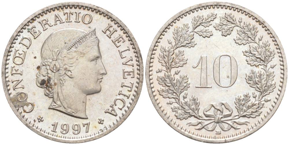 ШВЕЙЦАРИЯ 10 РАППЕНОВ 1997 В KM 27 медно-никель 55-542