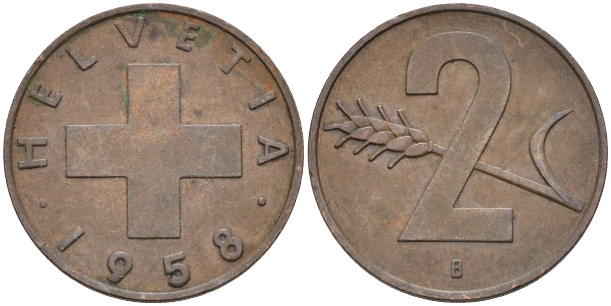 Швейцария 2 раппена 1958 В KM 47 бронза 4591-1216