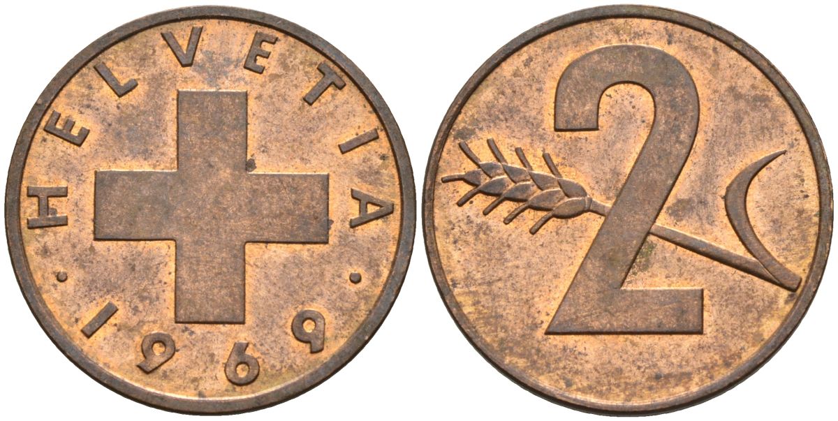 Швейцария 2 раппена 1969 KM 47 бронза 4592-541