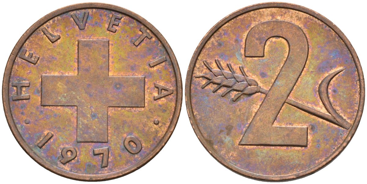 Швейцария 2 раппена 1970 KM 47 бронза 4592-647