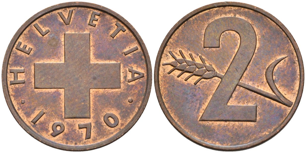 Швейцария 2 раппена 1970 KM 47 бронза 4592-715