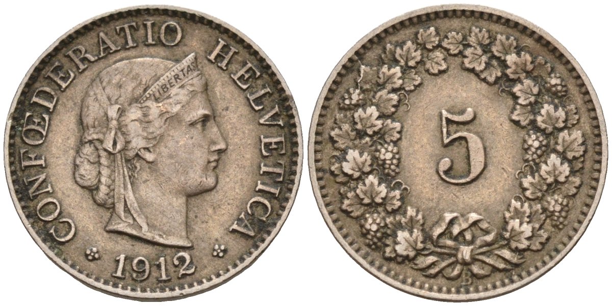 Швейцария 5 раппенов 1912 KM 26 медно-никель 4596-454
