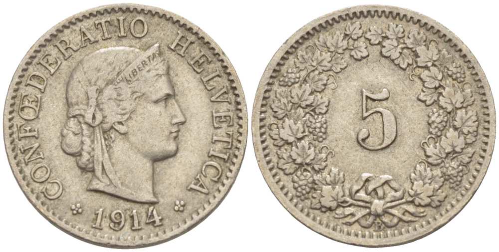 ШВЕЙЦАРИЯ 5 РАППЕНОВ 1914 В KM 26 медно-никель 3955-1129