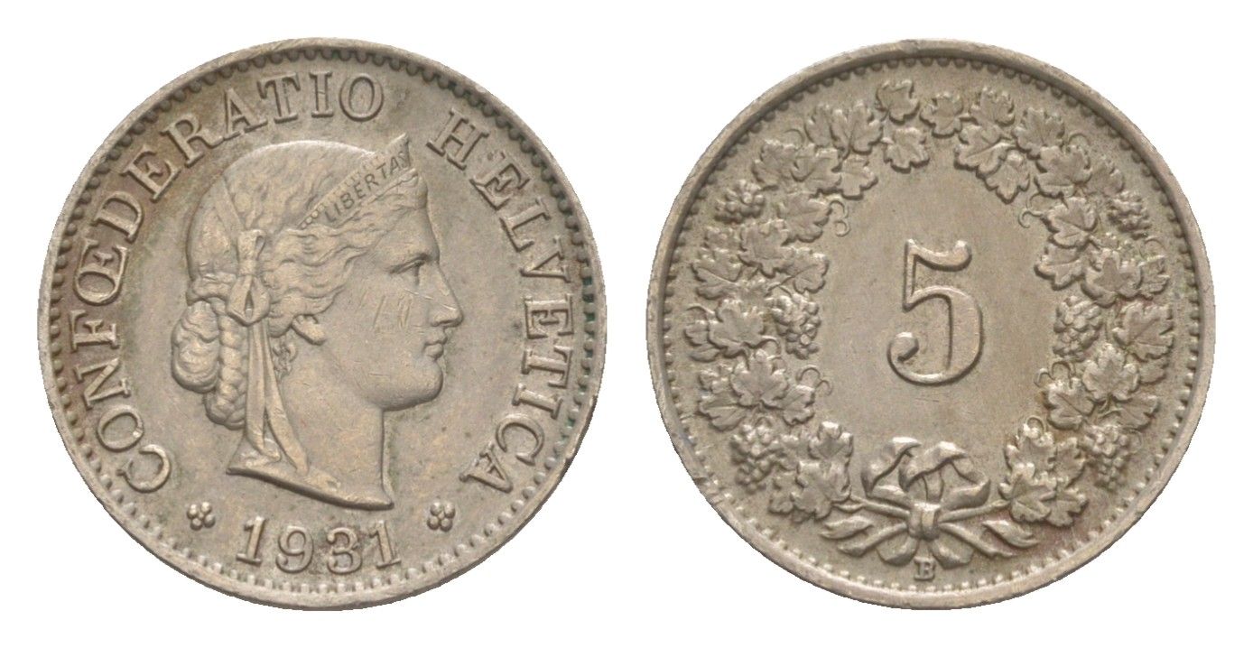 Швейцария 5 раппенов 1931 B KM 26 медно-никель 4630-1165