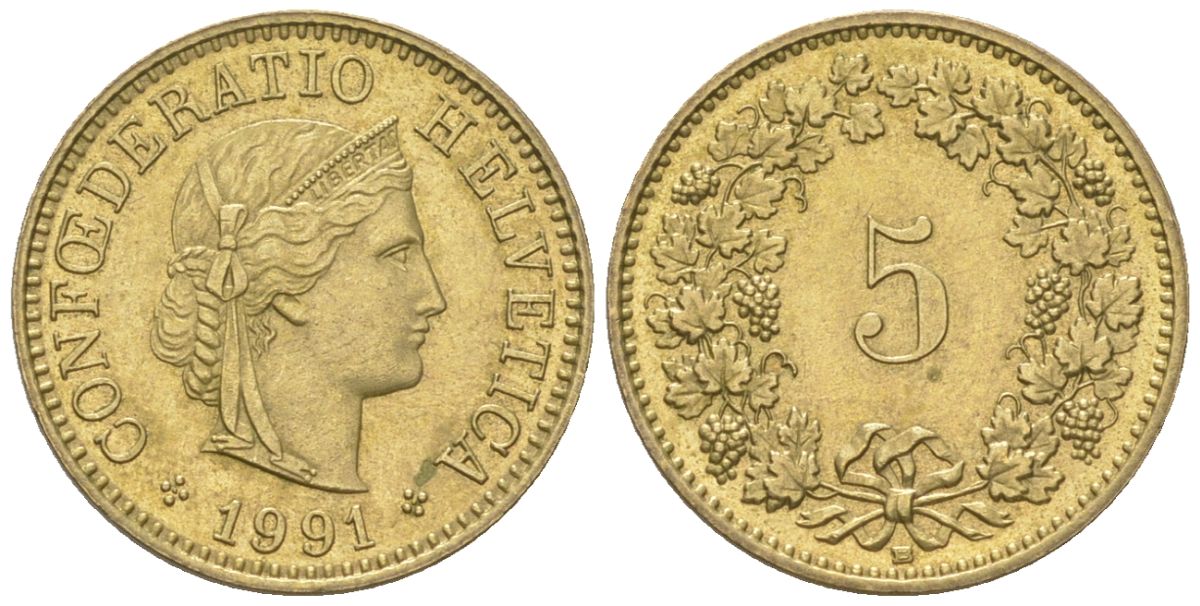 Швейцария 5 раппенов 1991 B KM 26c алюминиевая бронза aUNC 4115-1253