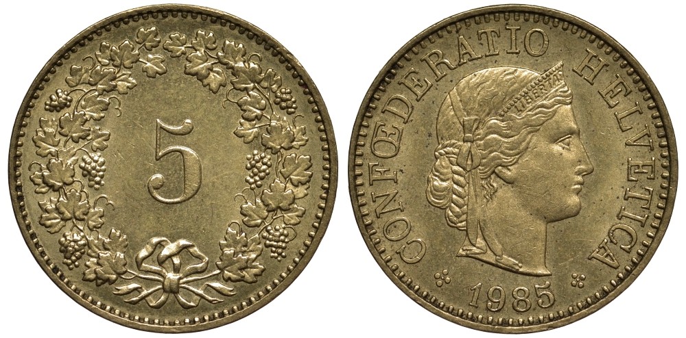 Швейцария 5 РАПППЕНОВ 1985 KM 26с алюминий латунь 186-1014