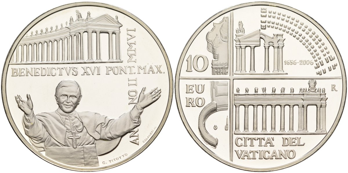 Ватикан 10 евро 2006 Бенедикт XVI, Джованни Лоренцо Бернини, колоннада собора Святого Петра, в оригинальной коробке, с сертификатом KM 384 серебро PROOF 7-1-44