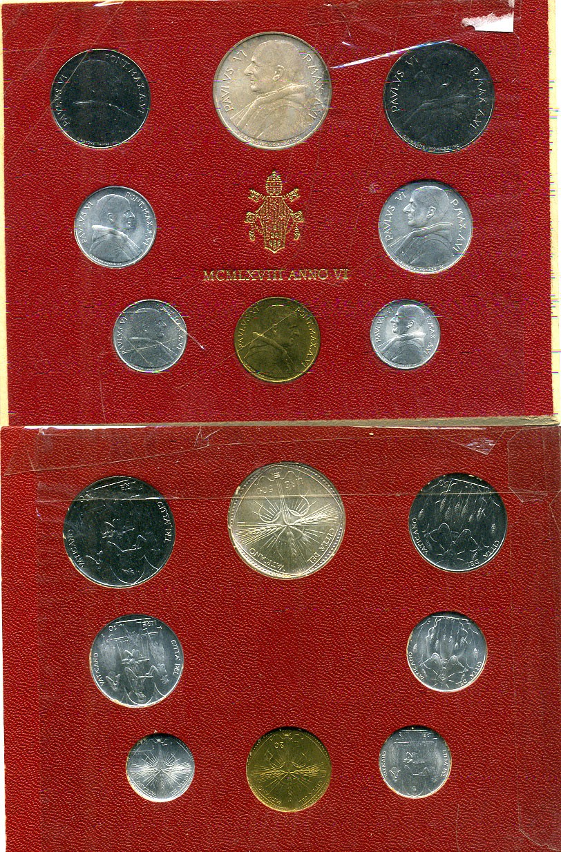 Ватикан набор из 8 монет 1968 1, 2, 5, 10, 20, 50, 100, 500 лир, в оригинальном буклете KM MS72 серебро UNC 8-1-01-04
