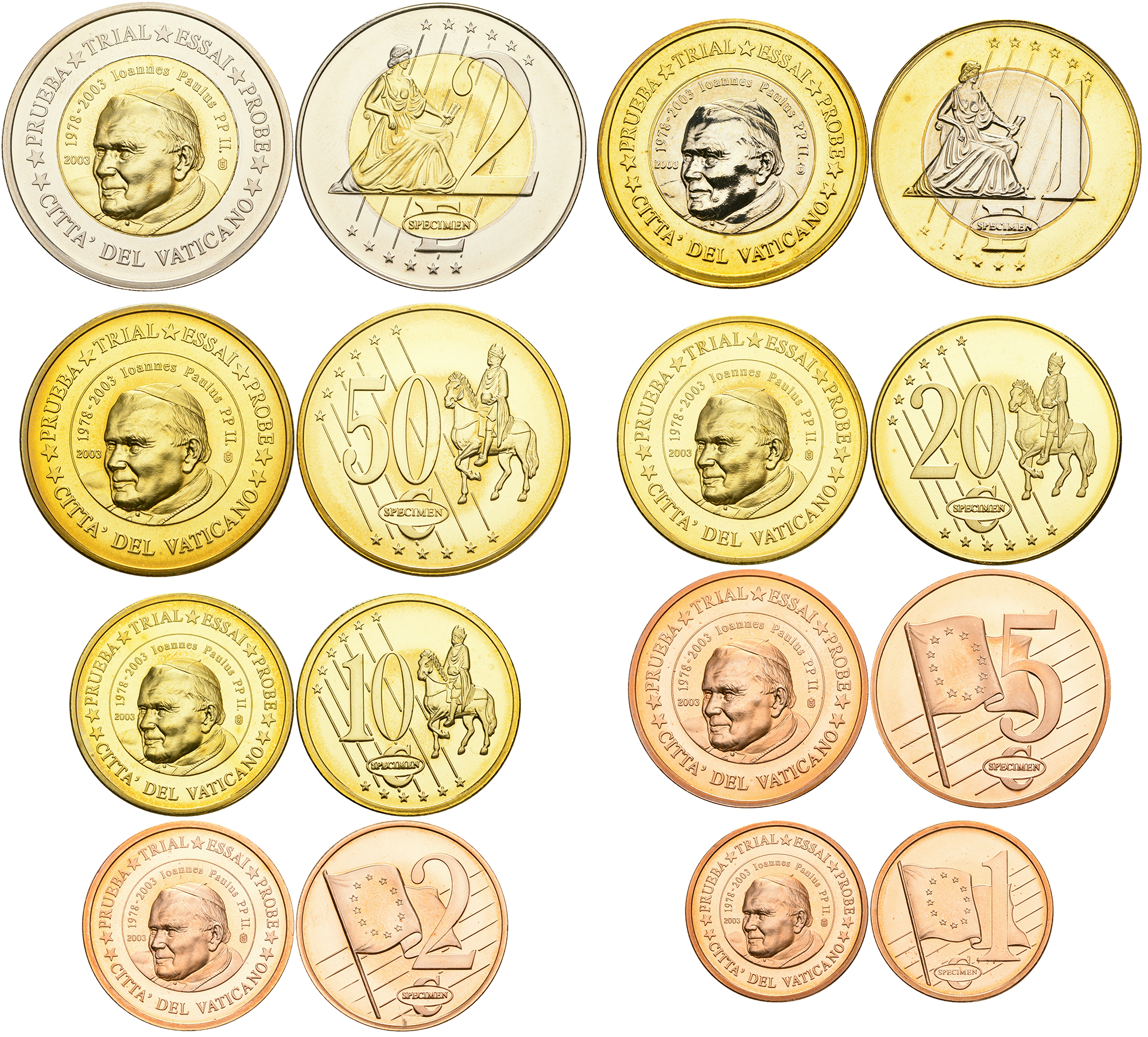 Ватикан набор из 8 монет 2003 probe, essai, европробники большого формата, в капсулах и буклете, Иоанн Павел II (1978-2003) PROOF 3-6-4-42