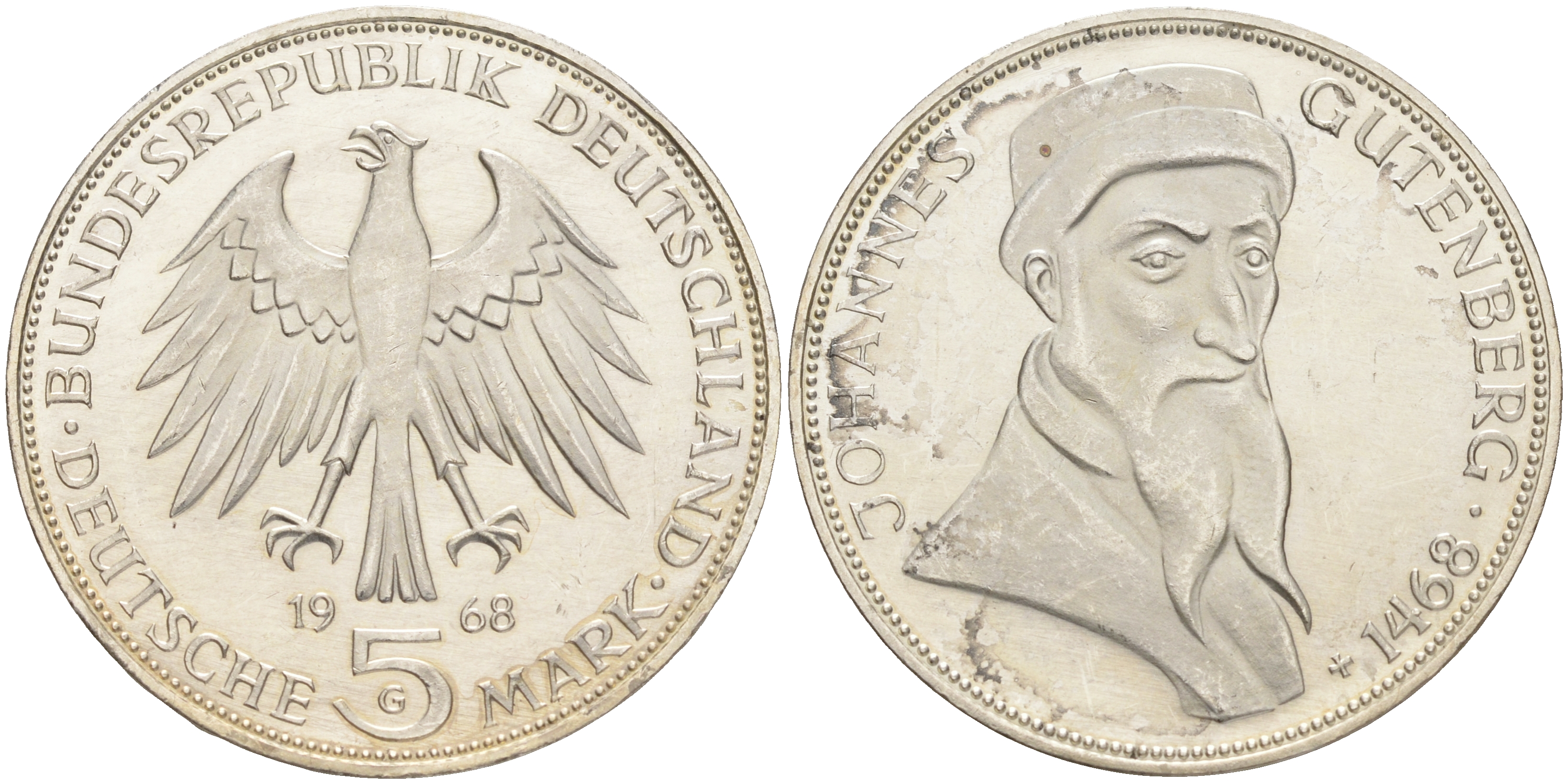 ФРГ 5 марок 1968 G, 500 лет со дня смерти Иоганна Гутенберга KM 122, J. 397 серебро UNC 4557-241